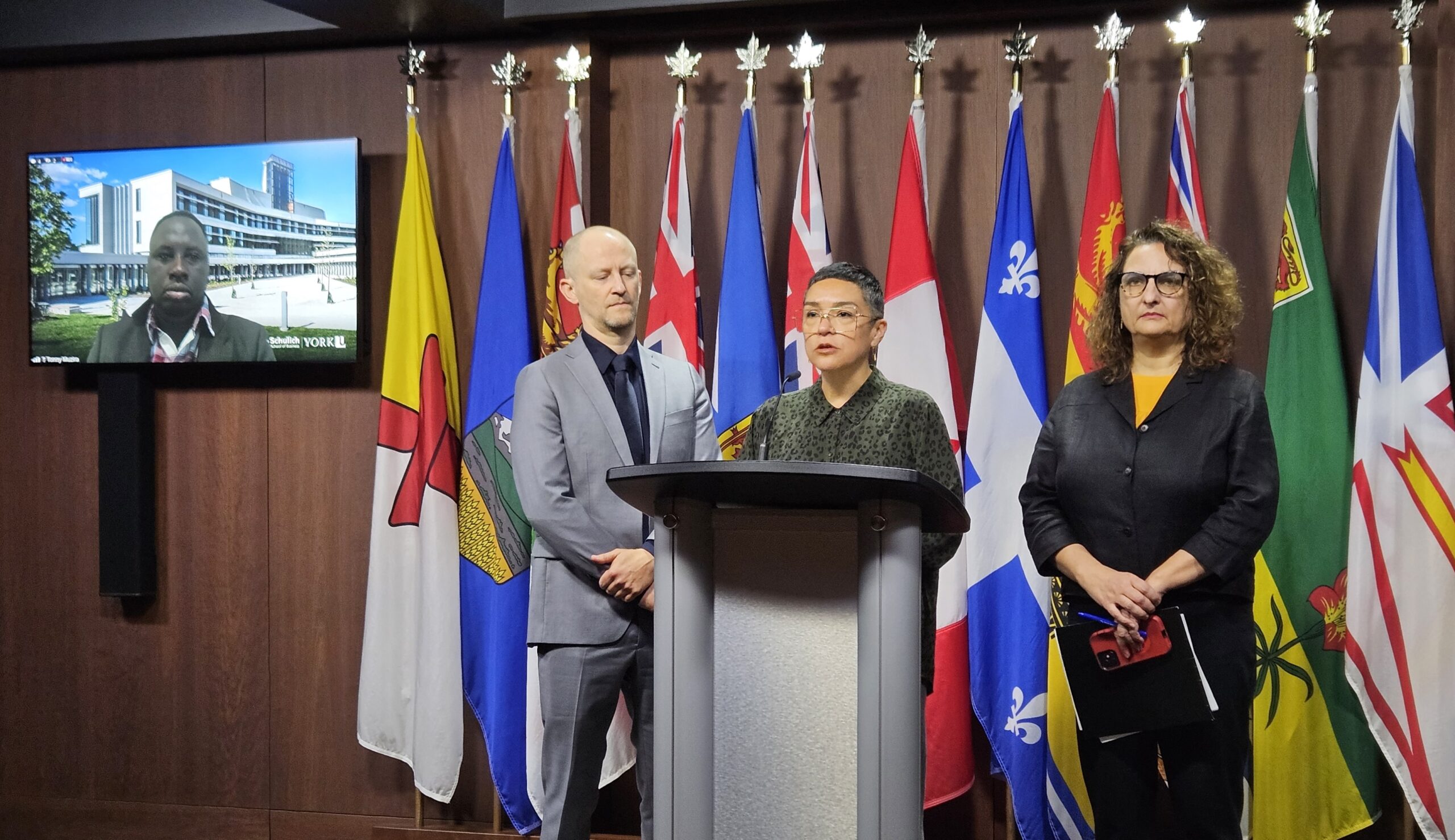 Speaking with reporters are Gauri Sreenivasan (Canadian Council for Refugees), Tamir Israel (Canadian Civil Liberties Association), Louis-Philippe Jannard (Table de concertation des organismes au service des personnes réfugiées et immigrantes, Front Commun Contre le Projet de Loi C-12), Nick Boyce (Canadian Drug Policy Coalition), Tonny Muzira (Centre for Black Development Options Canada), and Karen Cocq (Migrant Rights Network).